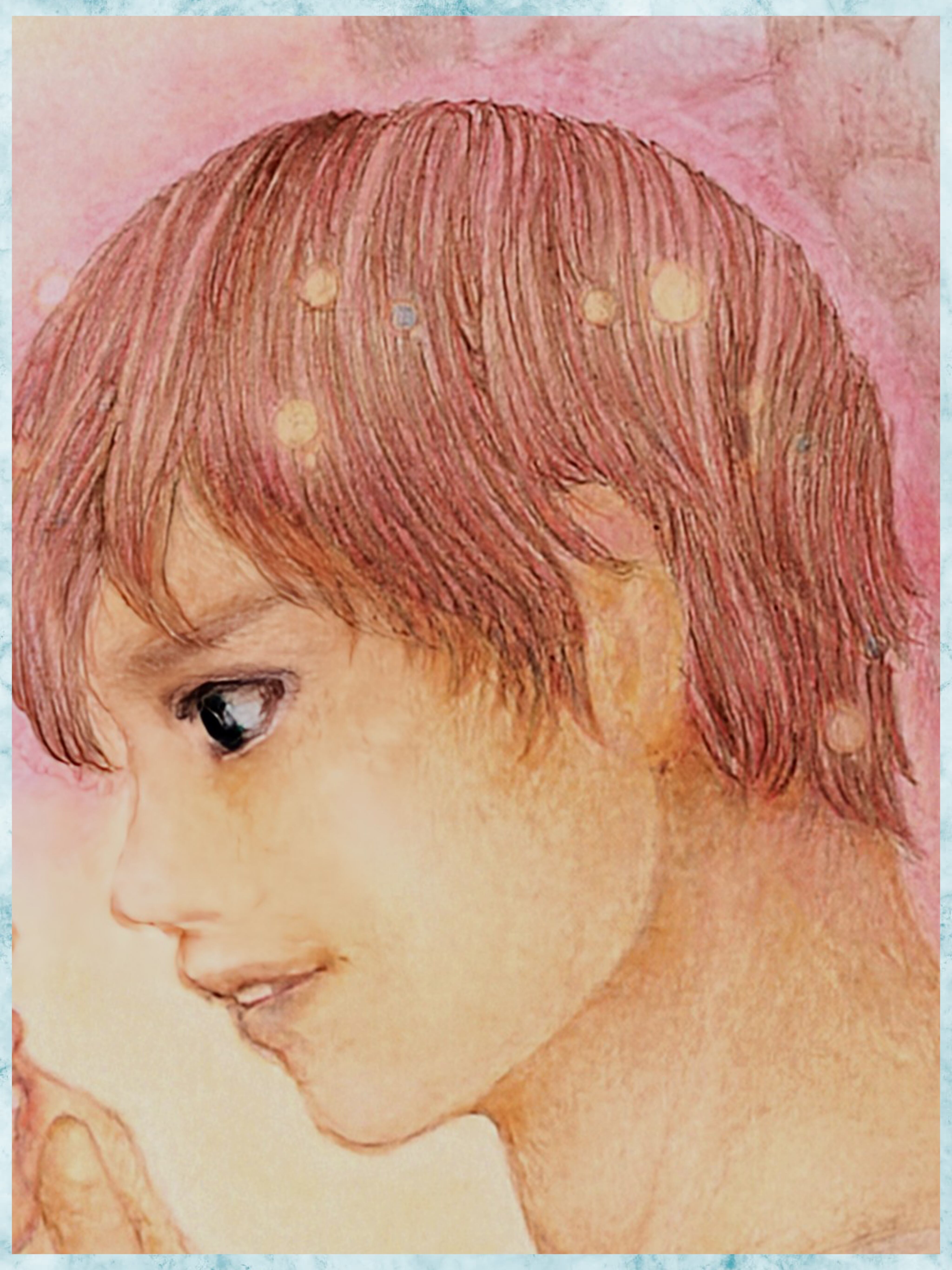 写真では明るく発色して見えますが、原画は色鉛筆独特の柔らかな風合いが感じられます。できるだけ実際の色合いがわかるように、アップの写真も掲載しておりますので、ぜひご参照くださいませ。